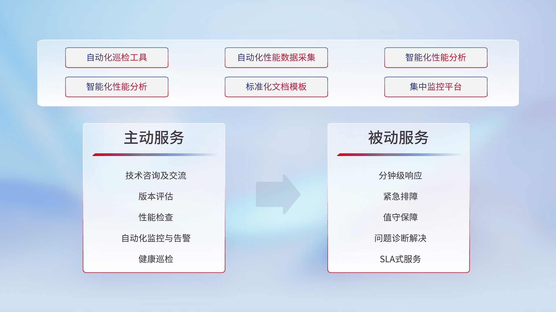 智能化工具和标准化文档,,保障服务质量,,,提供主动服务(包含技术咨询、、、版本评估、、、、性能检查、、、自动化监控与告警、、、健康巡检)和被动服务包含(分钟级响应、、、、紧急排障、、、、值守保障、、问题诊断解决、、、SLA服务)。。